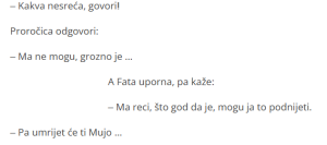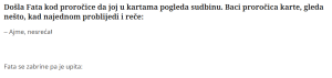 Fata je, kao i mnogi od nas, željela da sazna šta joj budućnost nosi, pa je odlučila da poseti proročicu koja joj je trebalo otkriti tajne sudbine. Kada je proročica počela da baca karte, Fata je bila sigurna da će čuti uobičajena predviđanja o ljubavi, sreći ili eventualno nekim manjim problemima. Međutim, proročica je iznenada postala zbunjena i uznemirena, što je bilo potpuno neočekivano. “Ajme, nesreća!” rekla je proročica, izazivajući momentalnu zabrinutost kod Fate. Niko ne želi da čuje reč “nesreća”, posebno kada je u pitanju zdravlje ili život voljenih osoba. Fata je, međutim, bila odlučna i nije dopuštala da proročica ostane u tom stanju nesigurnosti. “Koja nesreća, govori!” upitala je Fata, tražeći konkretne odgovore.