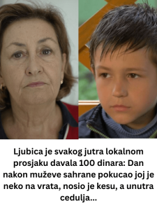 - Ali, kao što to obično biva u pričama o dobroti, neočekivano se desilo nešto što je potpuno promenilo tok njenog života. Nedelju dana nakon muževe sahrane, neko je pokucao na njena vrata. Bio je to Marko. Međutim, sada nije bio isti dečak koji je prošao pored nje sa kesom jogurta i hlebom. Imao je čistiju jaknu, šalu oko vrata i torbu u ruci. Ispostavilo se da je Marko došao sa porukom – nije zaboravio sve što mu je Ljubica činila. „Ne znam kako da vam se zahvalim. Hvala što ste svaki dan bili čovek prema meni. Sada želim da budem čovek prema vama. Nisam zaboravio. I neću. Vaš Marko“, rekao je.