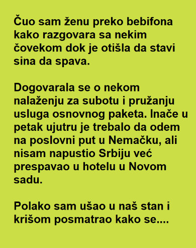 Dok je neprimećeno ulazio u stan, muškarac je mogao čuti zvuke koje nikada ne bi očekivao da će čuti. Zvuci razgovora njegove supruge sa nepoznatim muškarcem prenosili su se kroz bebofon. Njihovi razgovori o “uslugama osnovnog paketa” postali su mu jasni kao dan. U tom trenutku, srce mu je zakucalo toliko snažno da se činilo da će mu iskočiti iz grudi. Kada je zavirio u sobu, prizor koji je zatekao bio je strašan – njegova supruga u naručju drugog muškarca, dok je njihovo dete spavalo nekoliko metara dalje. Ovaj trenutak otkrovenja bio je gori od svih njegovih najgorih strahova. Bio je to trenutak koji je zauvek promenio njegov pogled na ljubav, brak i porodicu. Suočavanje s ovom istinom postavilo je pitanje ne samo njegove vernosti, već i njegove sposobnosti da veruje u ljude.