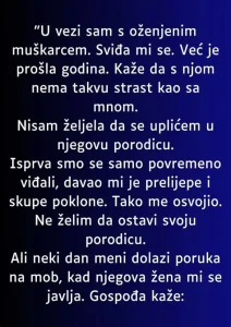 Kada je primila poruku od njegove supruge, njen svet se srušio. Poruka je bila ispunjena ljutnjom i bolom, a ona se našla na prekretnici. Koja je njena odgovornost u ovoj situaciji? Ova pitanja su je mučila, posebno jer je postala deo drame koja nije imala nikakve veze s njenim osećanjima, već sa posledicama njegovih odluka. Ponekad se ponekad čini da su emocije poput lavine koja se stvara i pokreće bez naše kontrole. Ova situacija je otvorila pitanja o etici u ljubavi i prijateljstvu, kao i o tome koliko često zanemarujemo sopstvene granice u ime strasti.